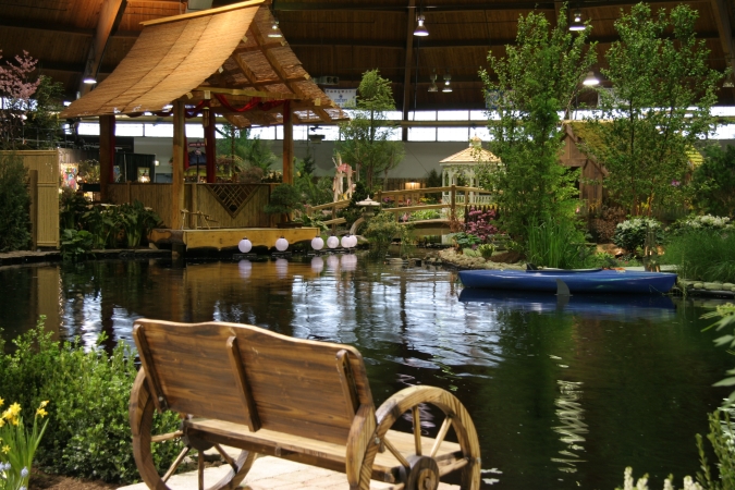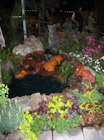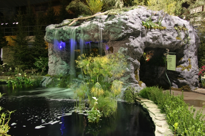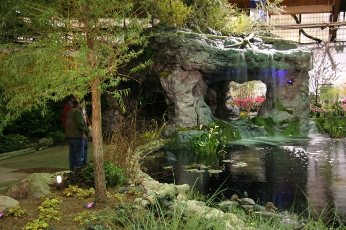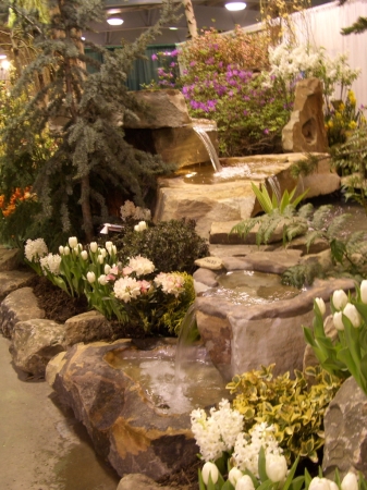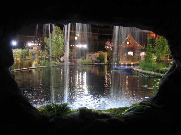 A babbling book, a reflecting pool, koi swimming in a pond. Water features add a lot to the modern landscape, and GardenScape exhibits have demonstrated creative uses of water over the years. Below are some examples, starting with our lake and grotto constructed indoors for the 2006 show, "Reflections".